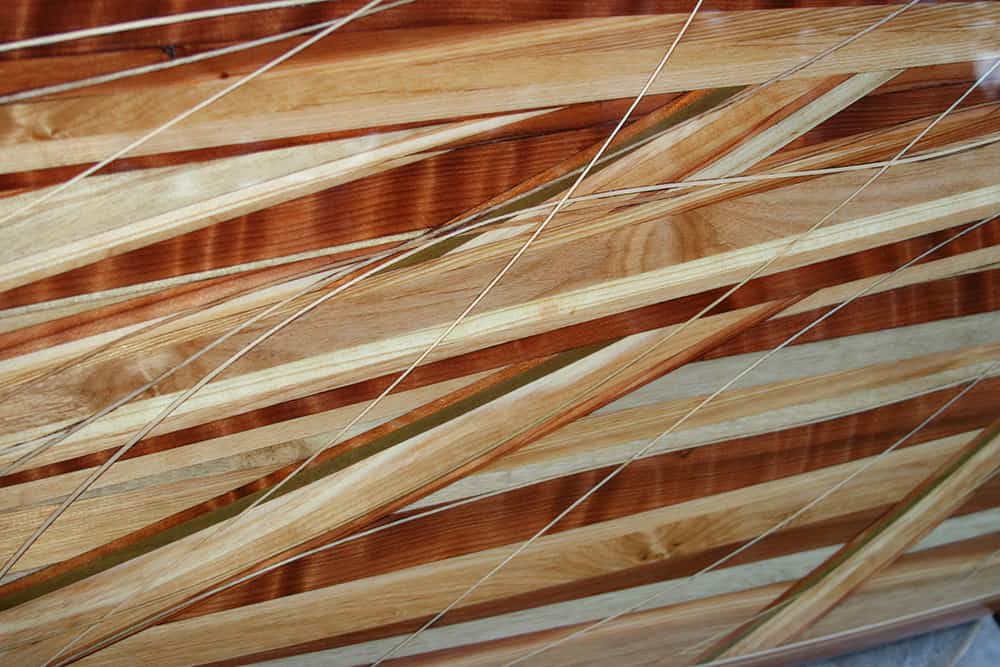 On the deck of this surfboard, I used curly redwood, paulownia, redwood, maple, and butternut. For the D.N.A. strand design elements, I used some green-ish poplar that I picked-up, as scrap, from a local cabinet shop, and also some thin strips of maple.