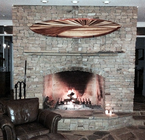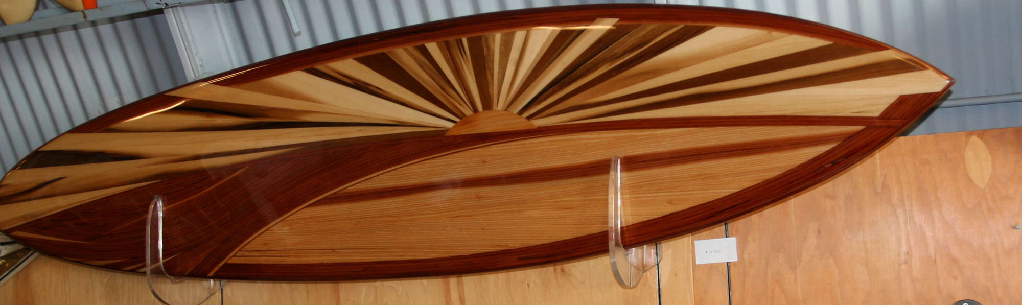 I used light and dark redwood, teak, cedar, pine, mahogany and poplar on this piece. The green and purple hues are from the poplar. I never use paint or tinted stain on my wood surfboards. Although, I have been known to occasionally use the kitchen oven to steam or cook wood to get what I’m after. Ha! I sure lucked-out by marrying a gal from the lumber industry who loves the aroma fresh-baked boards as much as I do.
