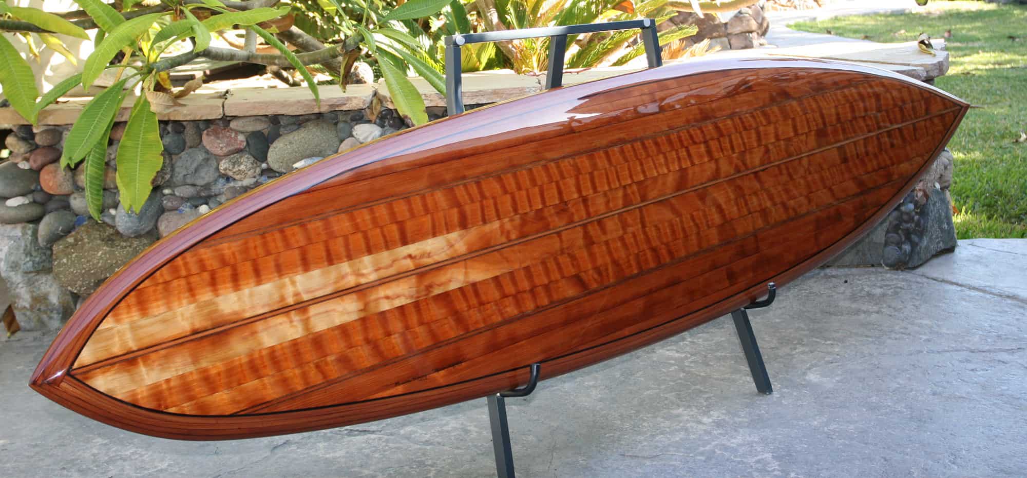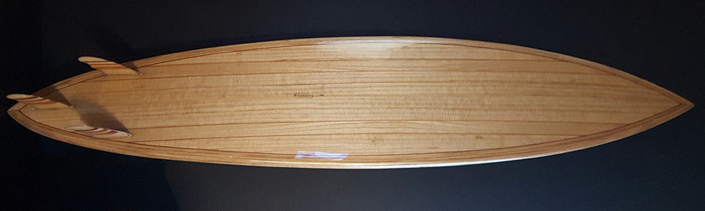 As with all of my surfboard art, this is a hollow wood surfboard strip-built over a wood frame.