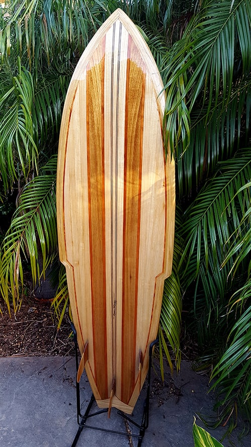 It’s a 6′ 4″ x 21-3/4″ x 2-7/8″ Sting inspired shape with glassed-on tri-fin set up. The fins are my own custom design, as well.