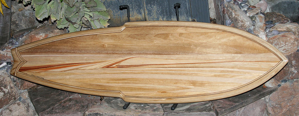 This piece is a hollow wood surfboard with artwork depicting a single ocean wave. I handcrafted this surfboard using the strip-build technique meaning each segment of wood is placed over a custom wood frame, one strip at a time.